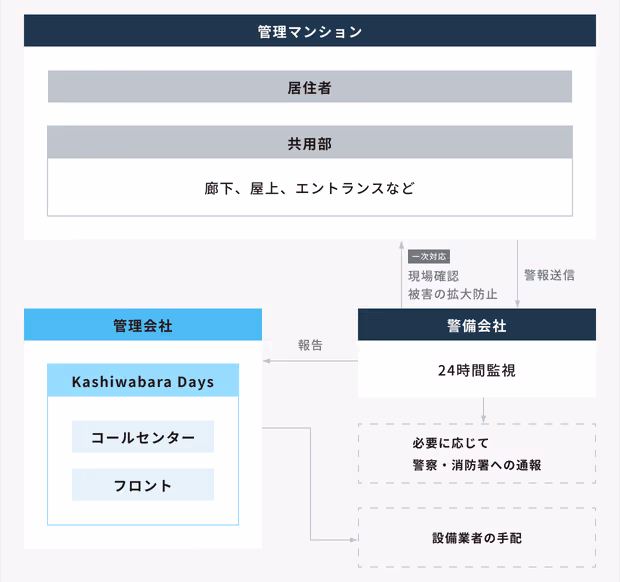 マンションでのトラブルに対応できるよう警備会社と連携のうえ24時間365日緊急窓口を設けています。共用部分の設備異常の場合、必要に応じて提携設備業者と連携してサポートいたします。